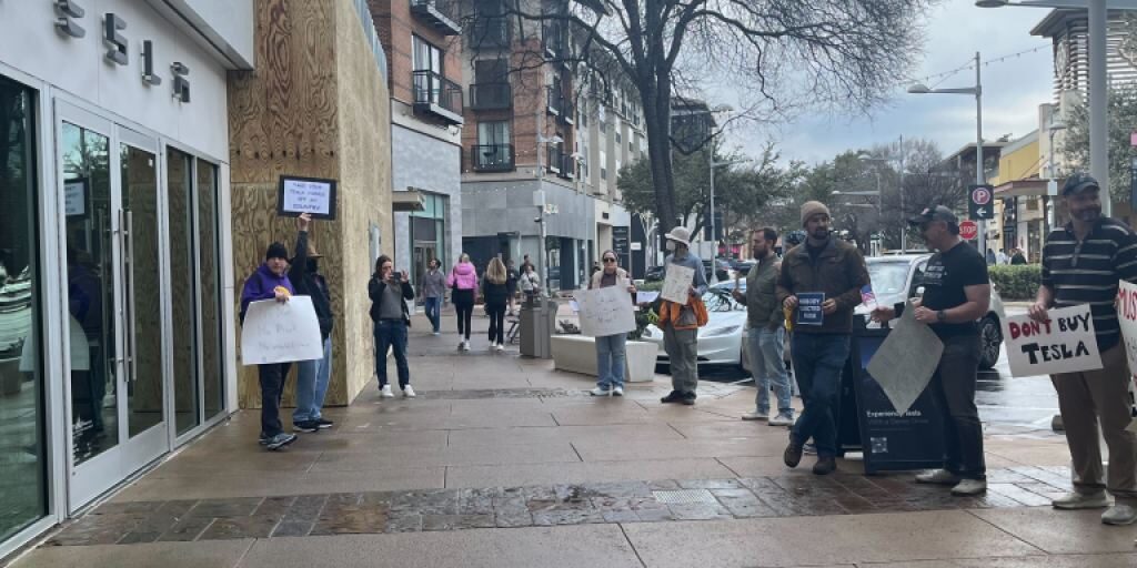 Protesters gather outside Austin-area Tesla store