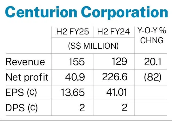 [SINGAPORE] Centurion Corporation on Thursday (Feb 26) posted a 82 per cent drop in net profit to S$40.9 million for its second half ended Dec 31, 2025, from S$226.6 million in the previous corresponding period.